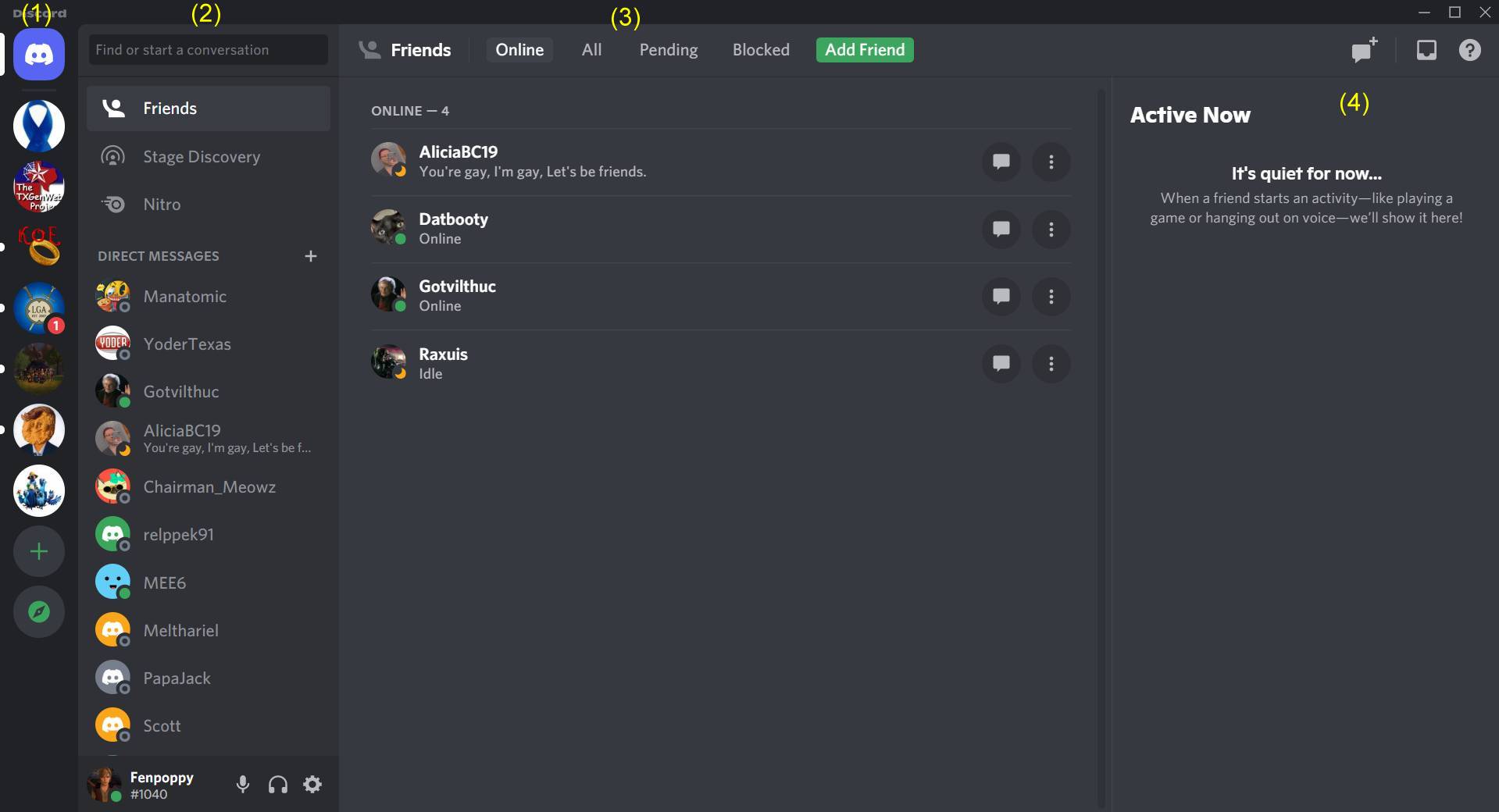 This screenshot shows how my Discord looks when I first open it. Yours won't look like this because you don't have friends or servers. There are FOUR SECTIONS - (1) a column of chat server icons, (2) a list of friends, (3) a list of online friends, (4) what your online friends are doing.